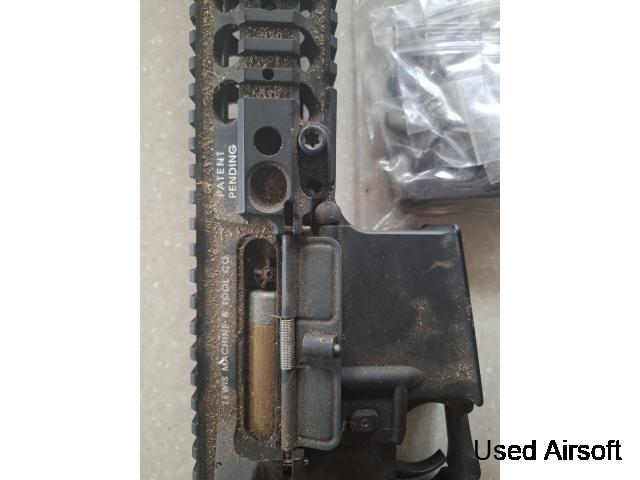 Never been shot or skirmished, just put together and abandoned in the shed without a box for years. Lots of sawdust and some metal filings to boot. Motor (G&P M120) probably shot, gearbox (also G&P M120) definitely needs a full strip down before you even think about firing this thing. Lot of the screws have some surface rust patina. The main reason I never got round to using this gun was I couldn't get the outer barrel to properly line up with the rail system. I've come to realise that is due to the rubbish G&P hop unit which doesn't fit with any other make outer barrel. Honestly, I'd just drop your own gearbox and motor in it with a new hop. I'm throwing in the pictured pack of G&P outer body parts like charging handle, fire selector, dust cover etc.