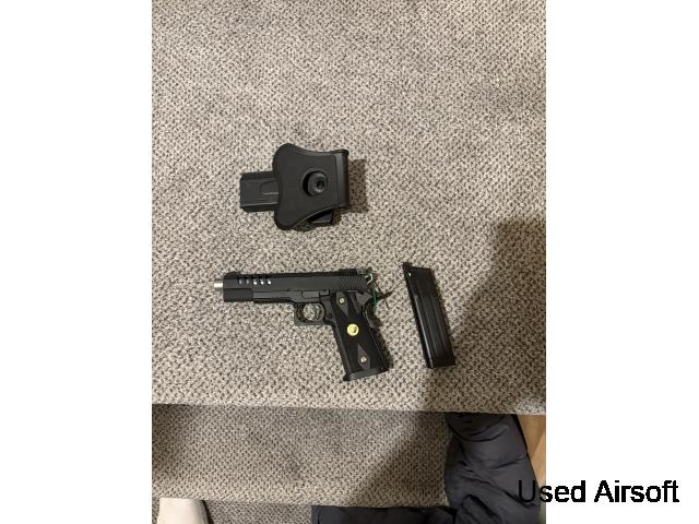 HG185 GBB G17 replica, roughly "two toned" in green and has a blue slide underneath, it still works fine but has a leaking magazine. This is a cheap entry level pistol, it uses green gas and has a plastic slide, it retails for £65 new and this has only been used a few times, I'm not delusional so it's priced just for t...