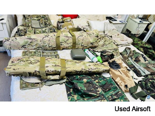 Genuine army ballistic goggles with lenses, Genuine army Osprey body armour with cummerbund and pouches, command patch, Hats, genuine desert kit trousers and shirt x 2 and tee shits x 2 , genuine British army kit trousers and shirt x genuine USA army kit trousers and shirt, binoculars, viper tactical gloves, British army desert camelbak hydration M4 mags M4 carbine needs work, VSR-10 Pro bolt action sniper as new. Other bits and peace’s great kit for anyone wanting to get into Airsoft selling as job lot do not want Job peace out. All you need to get going selling as unable to participate anymore reluctantly selling.