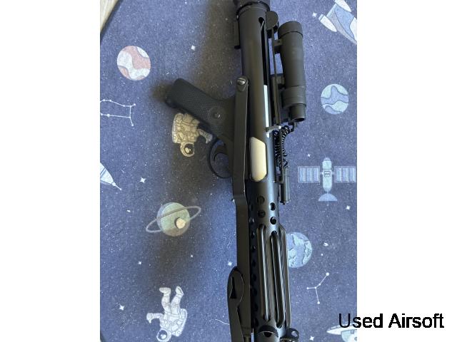 S & T E11 Blaster AEG full metal with working stock, scope, hop up. Comes with two 50rd mini stick magazines and a block battery. This type of blaster was used by the stormtroopers and is actually based on the sterling underneath! Open to reasonable offers. This is quite a rare find and retails for £400-450 new. Can be collected or posted.