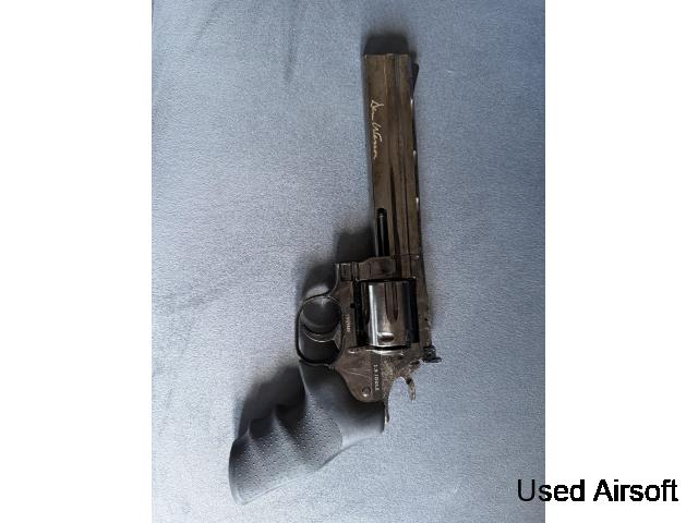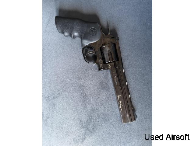I’m selling my full metal apart from the handle Dan Weston revolver Co2 powered. Selling this revolver due to not using it anymore it’s a fun bit of kit. Slight abrasions to the rear of the revolver due to usage over the years. This will come with a holster. Any questions feel free to ask.