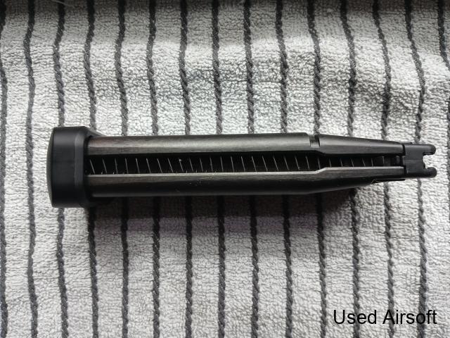 Hardly used at all- shot it a few times, put it back in the box and haven't used it since. All stock parts apart from the nozzle return spring which has been upgraded. Magazine has been stored with blue gas in it and all seals are intact. Comes with accessories- please see pics. Optical sight not included.