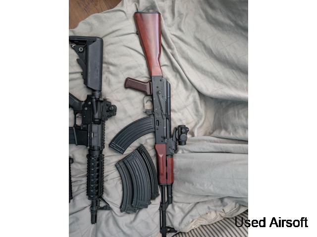 I have this AKM with some upgrades, they are 130% recoil spring, Bavtac nub, and pinkflamingo bucking it will come with the optic, the mount for the optic and 4 mags