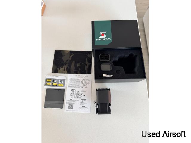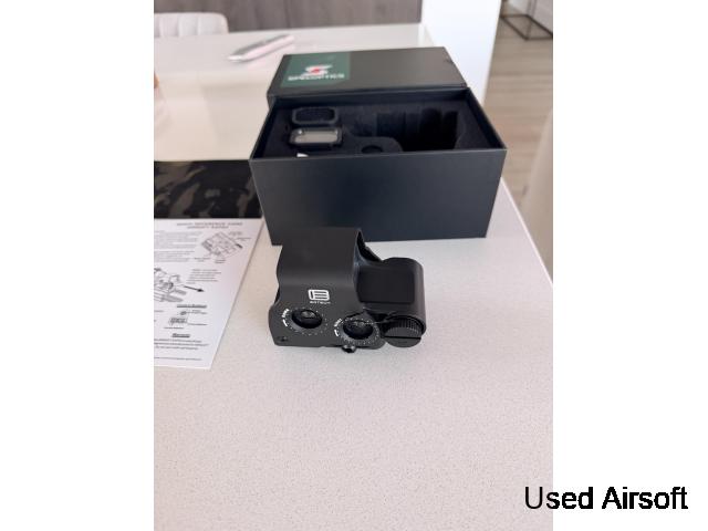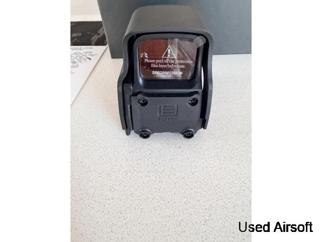 The lens is very clear with high light transmission, no mirror effect, and will not reflect your face or other objects. The housing is hard anodized, and the red dot is the EOTECH EXPS3-0 with NV functionality, compatible with NVG.