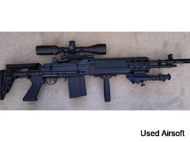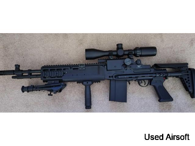 Selling my M14 since i'm downsizing my collection. This one has done one game, performed well but haven't used since. In full working condition, but has some minor scuff marks on the left side near the stock and forward sling mount. comes packaged in original box with a vertical foregrip, bipod and walther 3-9x scope with cyma m14 scope mount, original battery and two JG high cap magazines. Price includes shipping but can lower for collection.