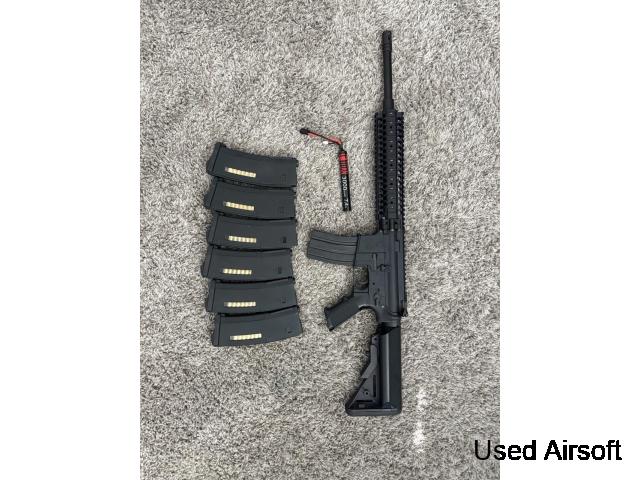 Full metal, folding stock, integrated tracer hop unit, programmable MOSFET. This RIF is built like a tank and has a very smooth gear box which fires brilliantly. Only selling because it doesn’t suit my game style. Comes with 6 mid-cap mags, mock suppressor and 7.4v LiPo stick battery that fits this RIF a treat. If you ...