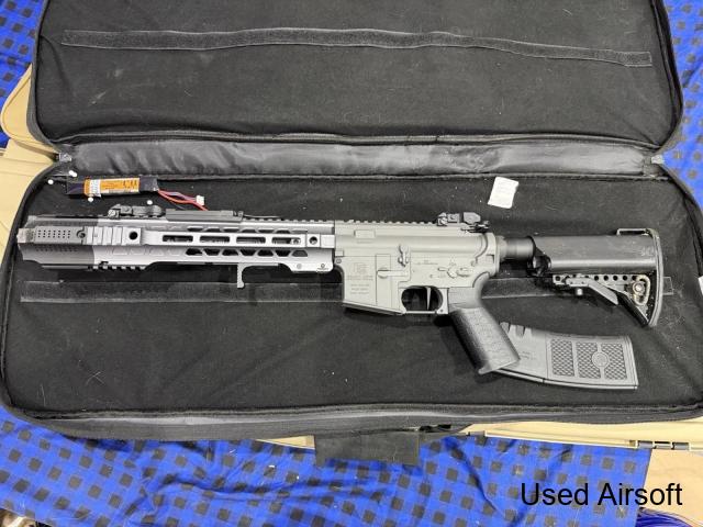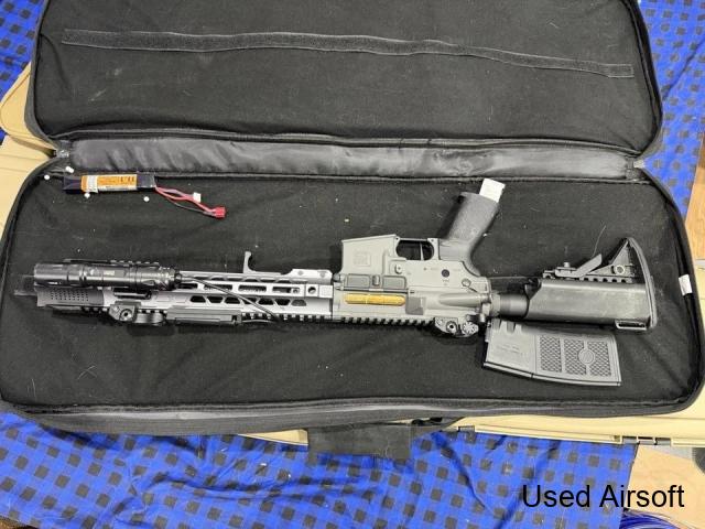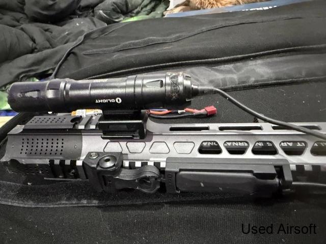 Full metal, folding stock, integrated tracer hop unit, programmable MOSFET. This RIF is built like a tank and has a very smooth gear box which fires brilliantly. Only selling because it doesn’t suit my game style. Comes with 6 mid-cap mags, mock suppressor and 7.4v LiPo stick battery that fits this RIF a treat. If you ...