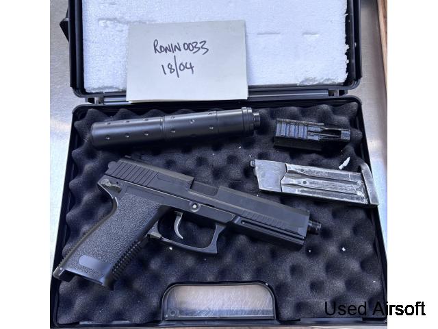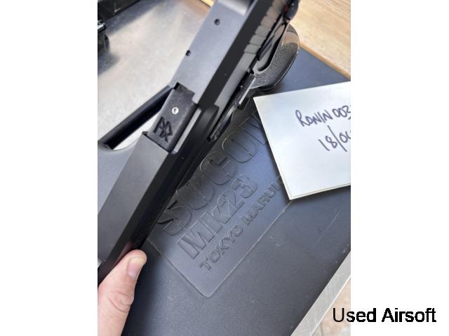 For sale, clone Mk23 SOCOM NBB pistol Unknown make (maybe STTI/ASG?). Comes in Tokyo Marui Mk23 case, with TM mag, and Hadron TDC hop cover fitted. Also has the “power up” suppressor and a 3D printed lower rail. £50 posted