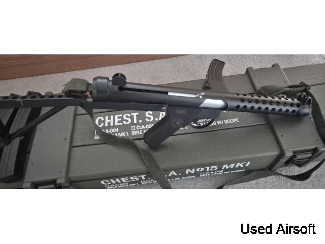 This one comes with SEVEN mags, real steel sling, a real surplus pouch for 3 of these and another 2 mags which seem to have lost their base plate (not pictured but I can send pics). The mag pouches are the rare UK ones that actually fit the 30rd mags and are pretty rare. Very, very little use from new.