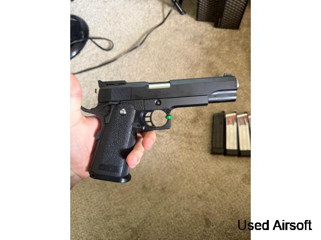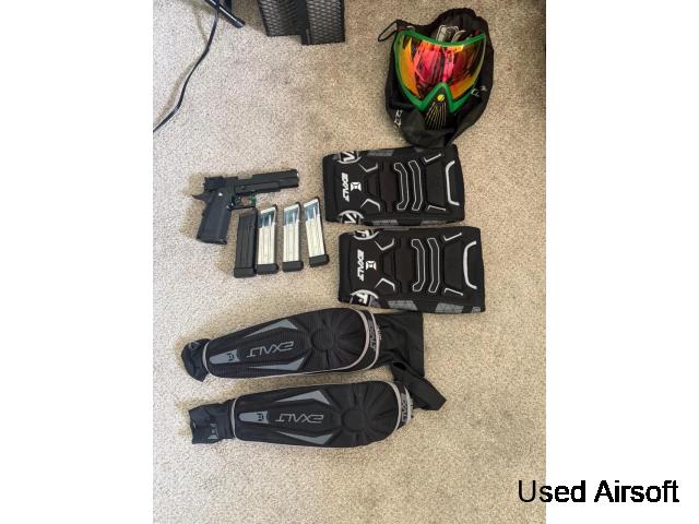 Selling my set of airsoft gear, it comes with my Tokyo marui hi capa 5.1 that has an upgraded spring. Also included is 3 spare mags, a Rasta dye i4 mask barely worn, and size S/M knee and elbow pads.