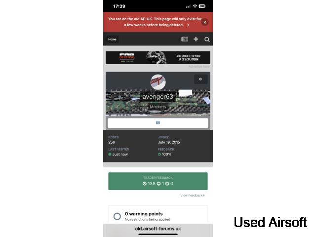 note: USED AIRSOFT "CONTACT SELLER IS DISABLED" YOU NEED TO EMAIL ME OR USE THE CONTACT NUMBER im not a retailer so no refunds, returns or warranties payment by bank transfer, paypal friends & family or cash on collection only However, for your peace of mind here is my airsoft forums uk site, 138 sales 100% feedback. Airsoft forum UK has just updated its system and wiped everyones feedback, so i have lost 10 years worth, their answer was take a picture before its wiped so thats in the advert pics below. I can do a test video once a deposit paid for your piece of mind