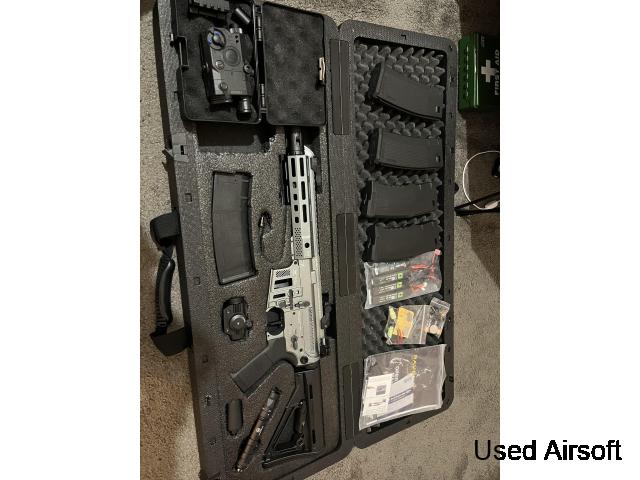 Comes with a torch and tracer phexbox green laser and torch and red dot sight