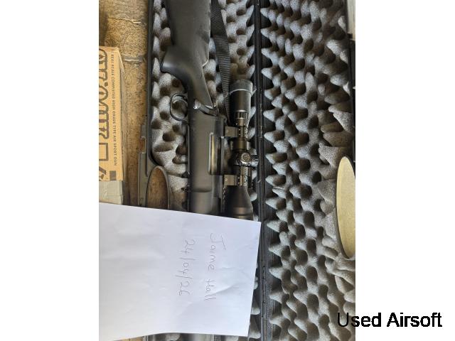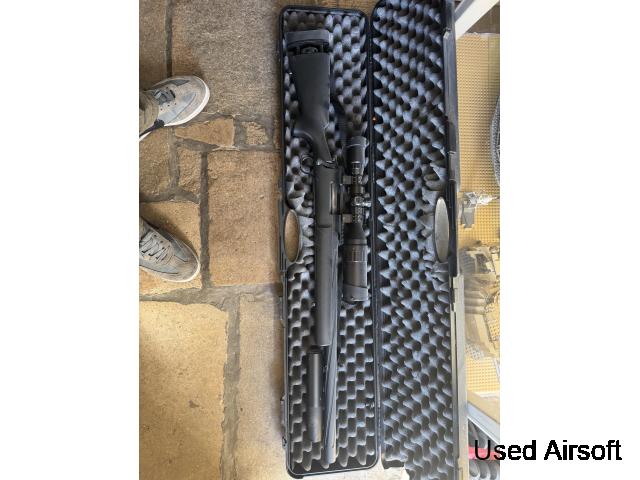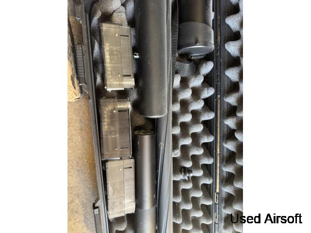 Novritsch SSG10 package for sale, excellent condition, only used 2–3 times so it’s practically new. Rifle works perfectly and has a 2J spring installed, original spring also included. Comes with scope, suppressor, 2 magazines, speedloader and a selection of BBs in different weights. Also included is a gas pistol with s...