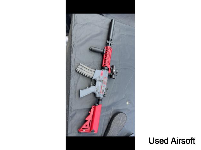 M4 Style airsoft gun, grey base with red two tone.