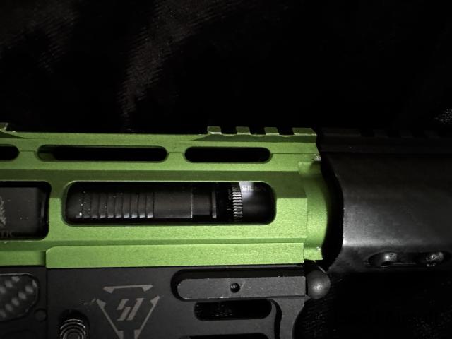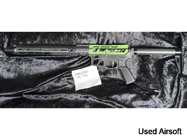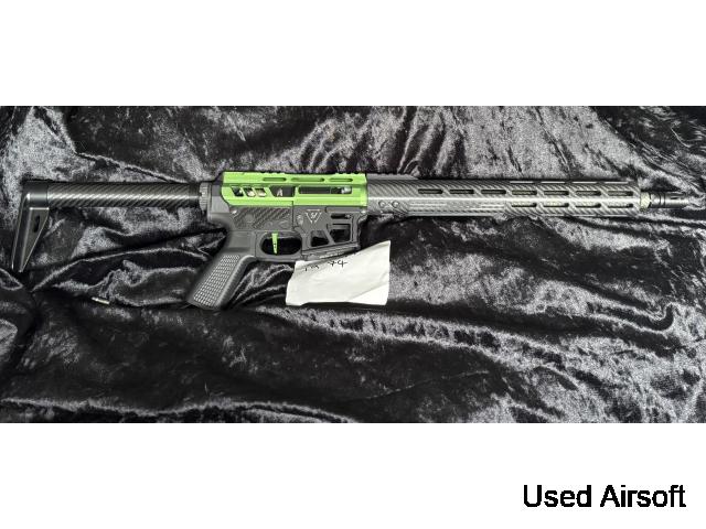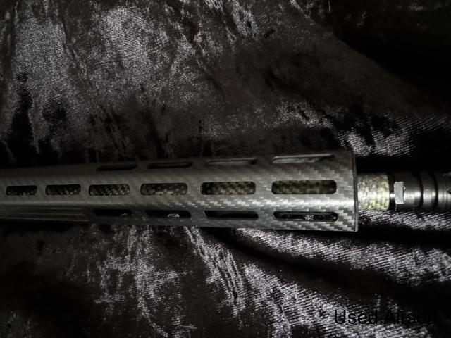wolverine article green goblin dmr/speed gun build, this is fully carbon up with 13.5" full carbon hand guard,14"green carbon outer barrel, carbon rear stock