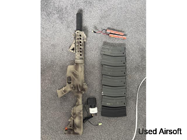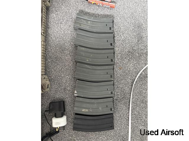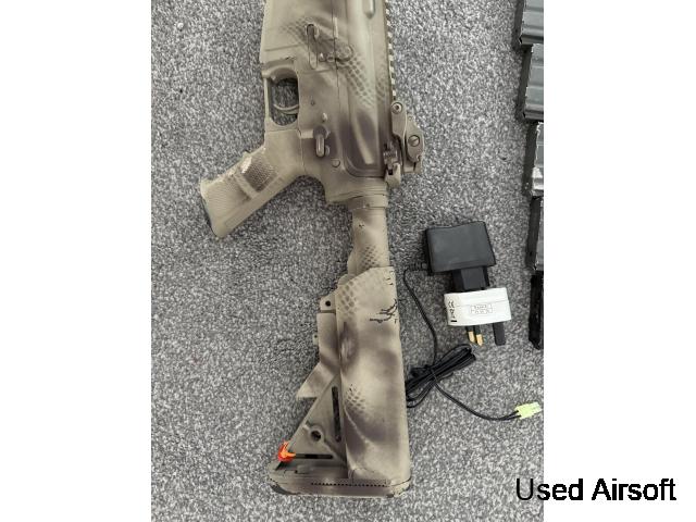 M4 with a new gearbox, gears, barrel, spring and bucking shoots very quick comes with mags and battery and charger. Box included can ship. £110 of upgrades