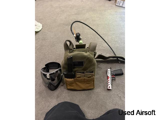 For sale as a bundle is Tokyo marui airsoft, Mask, Tactical Vest, Air Tank Set, tracer unit, bbs, mags.