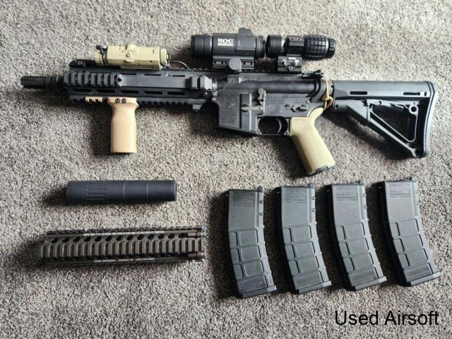 Package includes: Gun, 4 x 40 round magazines, Original Daniel Defence foregard, L119 foregard fitted, Advanced Armaments QR Supressor, BOG Tactical Reddot & Bumlon Magnifier.