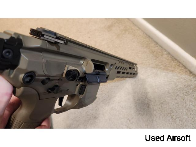 Salvo Precision MCX Spear LT 11.5 V1 + Upgrades Performance * Hops 0.32g BBs well Magazines * 5x Modify Tech mags (taped to prevent wobble) * 1x Original Salvo mag (for spares) Upgrades * Jaeger Precision NPAS (original included) * Jaeger Precision bolt screws (original + spares included) * Waldo Dynamics 120% spring (spare + original included) * Waldo Dynamics hop-up arm (original included) * Flamingo 60A bucking (original included) * Tokyo Marui 260mm inner barrel (original included) * TPU buffer pad (original included) Comes with original case