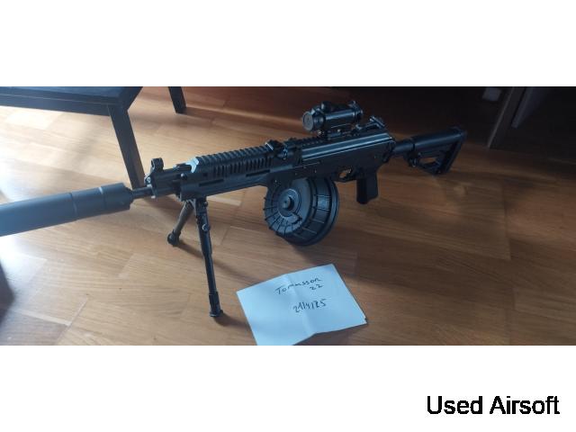 I have used for one game, bought of a friend which had been used for 3 games. Has a slight chip (pictured) does not affect usage at all. Comes with red dot sight, battery, grip, loud-encer and one high cap mag. Brilliant little gun, purchased for my first CQB game but realised that CQB isn’t for me, and purchased a sni...