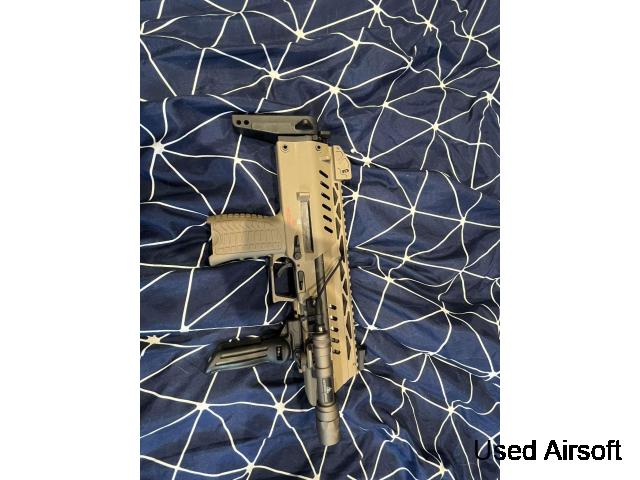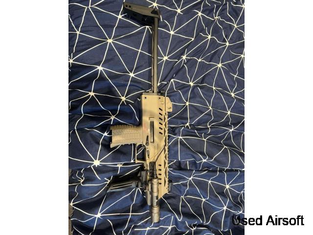 Length: 700 mm – 780 mm Velocity: 380-410 FPS (6mm 0.20g BB) Weight: 2700 g Magazine capacity: 40 rounds (recommended loading 30 rounds) Material: Aluminum, Steel, Nylon reinforced polymer Firing modes: Semi & full auto Power source: Green Gas or C02 (with blowback recoil) Package includes: Gun, 4 x 40 round magazi...