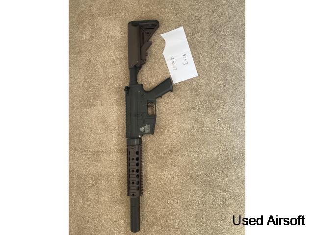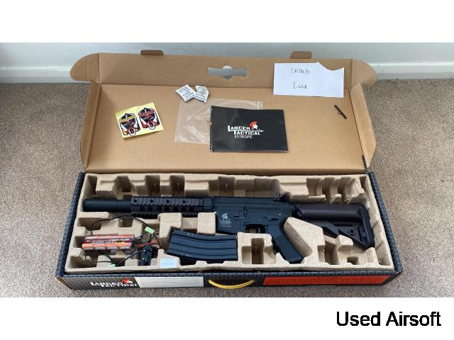 This is my lancer tactical M4, it used to be 2 tone but I then sprayed it the only reason for selling it as im expanding my airsoft guns vault and it's just collecting dust. It comes w one hi cap mag and a battery