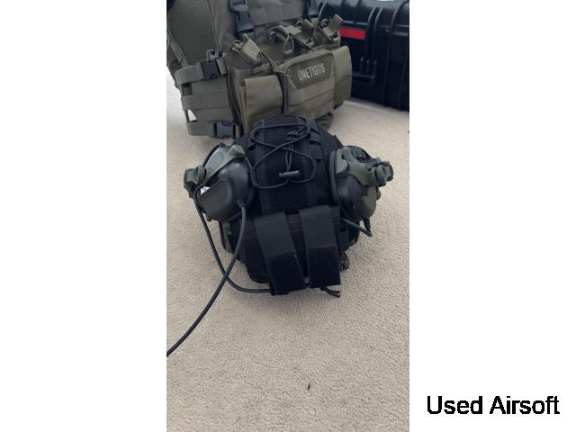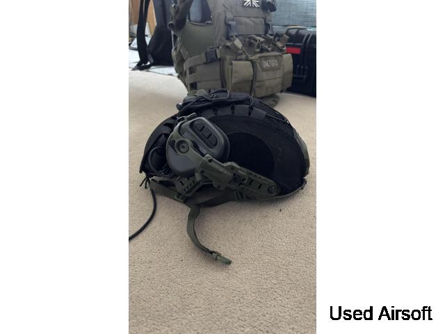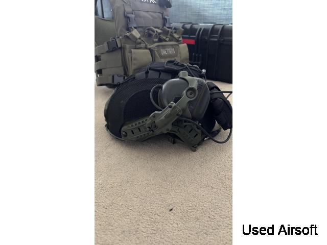 selling my helmet setup, helmet is green with black cover and black Mohawk. Comes with auto noise reduction headphones.
