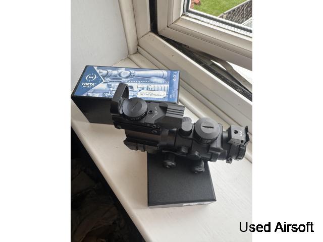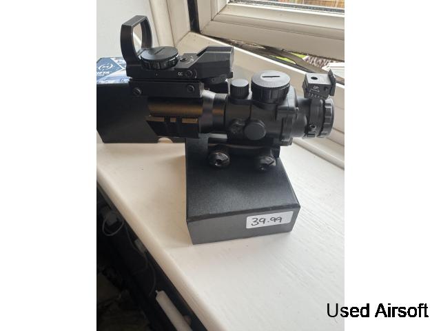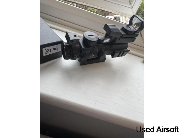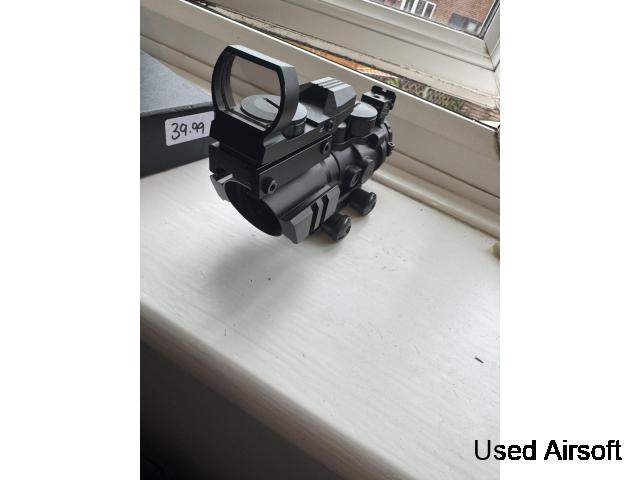 ACOG Scope with Red Dot Sight, detachable. ACOG and Red Dot have a couple of colour sight variations that can be used.