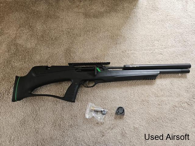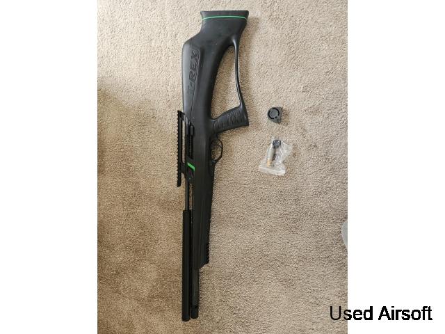 Remington t-rex bullpup PCP air rifle. is a fully polymer stock so is incredibly light. has a switchable lever so can be shot left or right handed. comes with a 10 shot magazine and the nozzle for the air tank as well as spare seals. was my farm rifle for a while before i had enough money to move on to better things however this rifle is still a lot better than it looks. fires at 11.5lbsft and has never given me any problems. Collection from PR3 or can get delivered through a courier if the postage is paid for. Text or email to enquire.