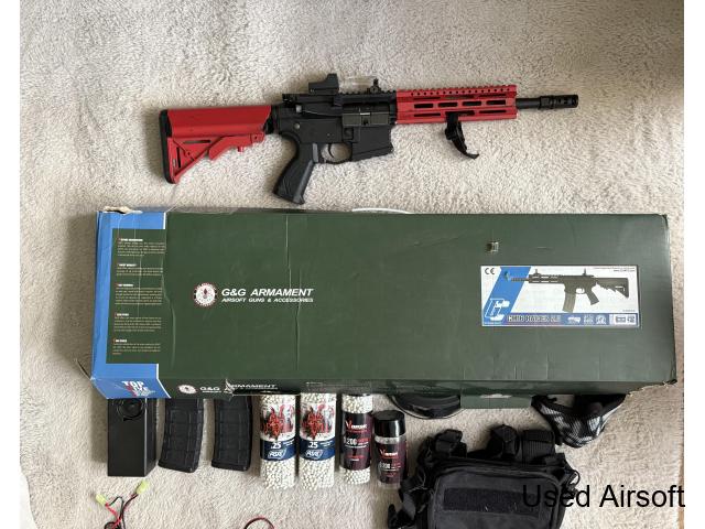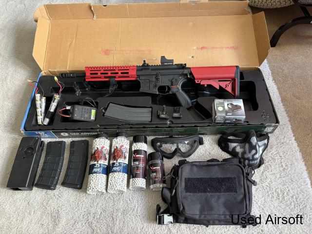 M4 Style airsoft gun, grey base with red two tone. comes with tracer unit, bbs , battery , charger, spare mags ,red dot sight and silencer bundle will come with everything listed in the description photo gun has never been used in game.
