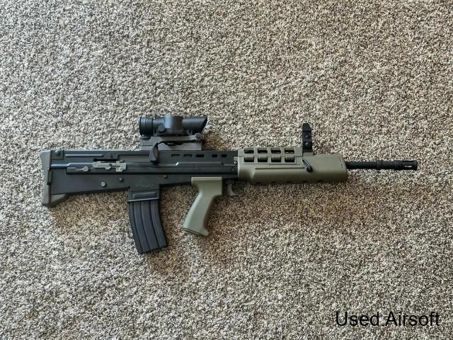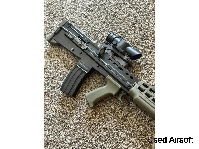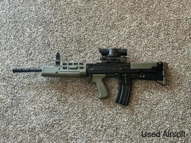 Ghetto blaster, turning to a urgi. Rail modded to fit to the ghetto blaster body. Angry gun buffer tube, tm buffer weight and spring, clone ctr stock, live free die co kung fu grip, suppressor, maple leaf rubber and nub, tm inner barrel, tm stanag magazine, npas installed. Fully working. £280