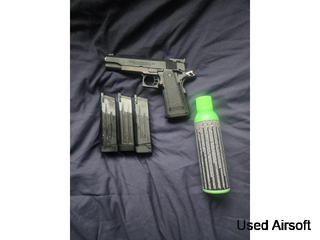 A used Tokyo Marui Hi-Capa 5.1, used only once in a airsoft match and only a few times recreationally but other than that its been sitting around without use. I purchased a 3 years ago new, it probably needs some maintaince (oil/greasing intenals) as i havent gotten round to do it. It works perfectly. Plz note all mags have started to leak unfortunetly so it would need mags which are common or repair. Contact:07414938732