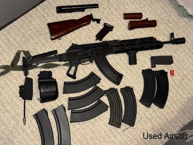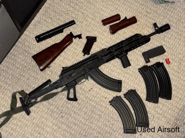 With a heavy heart I need to sell my AKM due to a medical issue and the recoil causing pain, This is one of my favourite rifs of all time! Very accurate with a very strong recoil! The weapon itself comes with original faux wood, and a whole bunch of upgrades! 5x gas mags (modded to hold 39rnds) AirTac hpa to aeg ak adapter plus 5 mags GK Tactical drum mag converted to hpa 5ku stock and hand guard, muzzle KGB grip TWS top cover/rail Jager hop arm Flamingo hop Bav tac power valve set Bav tac 115% recoil spring This is a proper head turner! Postage or collection possible