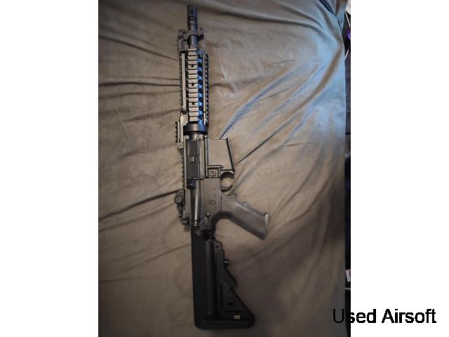 Bought about 2 years ago and has seen no more than 2 skirmishes. Been kept in the cupboard for the past couple of months and has been spraypainted black with a few spots of blue coming though around the stock and handguard, with some natural scuff scratches round the grip.
