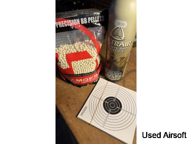 Contains: Can of Green gas Paper targets Bag of 0.2g bbs Collection : Kirdford Cash on collection