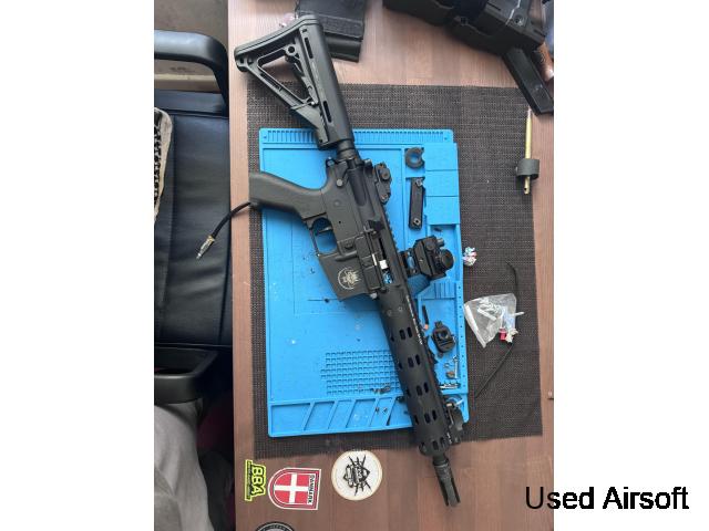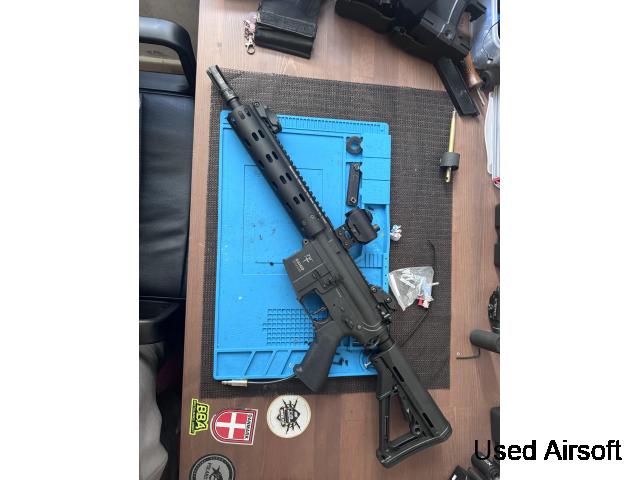 Polarstar jack Saigo defence body maxx hop unit repro ctr stock and madbull Daniel defence mfr rail 9” (nightmere to find )also includes a short inner barrel outer barrel and suppressor for a honey badger esc look for more info please contact me looking for £400 collection from Liverpool or postage