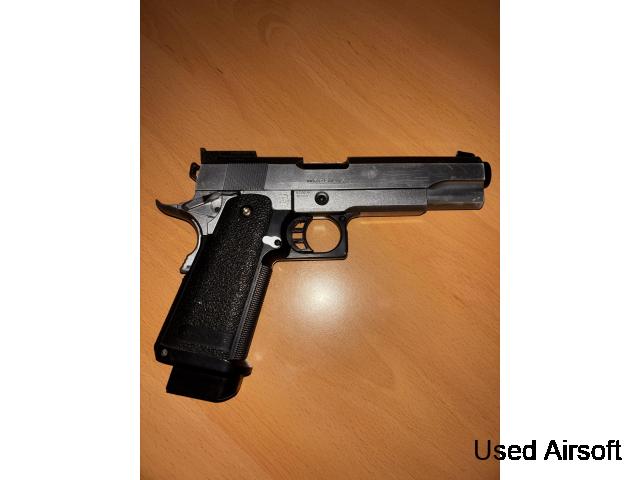 Tokyo Marui 5.1 Hi Capa Silver Gas Blowback Pistol, has seen some fair use, comes with a PTS MEC GBB Purple Hop Up Bucking installed, otherwise is still in great condition. Price includes postage.