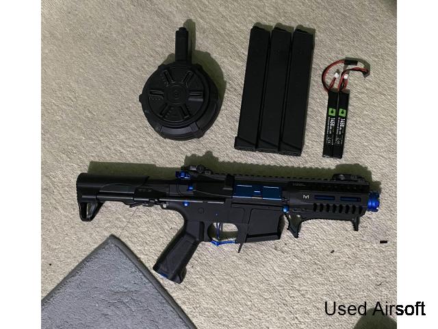 Hi, as you can see from the photos I am selling a HERA ARMS CQR in tan. It's an absolutely fantastic gun, used twice at CQB & once on field. Comes with a high cap mag & a mid cap mag. A 7.4 lipo 1550 mah battery Has blow back function, which makes it sound the nuts.. Plenty of sling points on it. Please don't h...