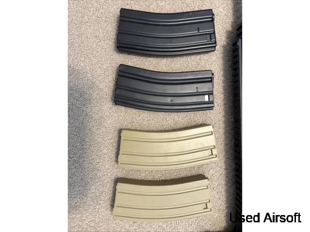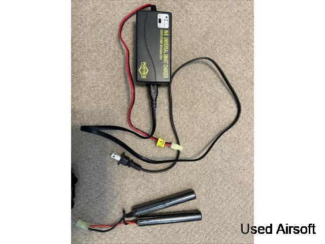 This gun is in perfect condition. I have used it only a handful of times and it has never given me issues. The insides are in perfect working condition, all metal internal parts. The stock, grip, and barrel are plastic, the rest is genuine metal. The gun comes with 4 magazines, 2 bags of BBs, battery, and battery charger. The battery loads in the back of the stock, the back is able to be removed by pulling it out. Also this will come in a soft case capable of carrying the gun and the magazines.