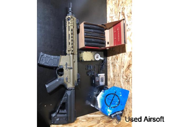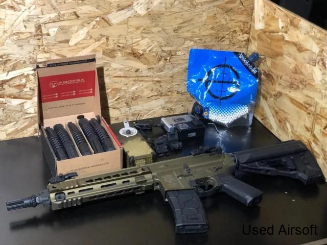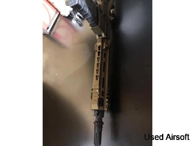 The Elite Force / VFC Avalon Gen2 VR16 Saber CQB M4 AEG Rifle is a high-quality electric rifle designed for airsoft enthusiasts. This model offers a realistic replica of an M4 rifle, featuring a sleek bronze color that is perfect for outdoor sports and recreational activities. With its reliable performance and durable construction, this AEG rifle is sure to provide hours of fun for shooters of all skill levels. Whether you're a seasoned gun enthusiast or just starting out in the world of airsoft, this rifle is a great choice for your sporting goods collection.