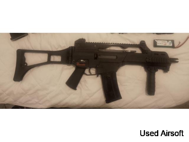 KWA Q10 with box, stock mag and sights, paperwork (new £410.) 2x Titan 11.1V Batteries (new £46.99 Each.) KWA AEG MS120 3x pack of magazines 120rd (new52.99.) This is a used Rif bought around 1 year ago that has been used for around 10 games at most so not seen a lot of use, cant remember what bucking and nub is in it ...