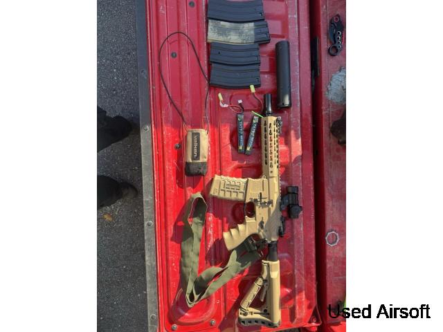 Tm ngrs scar l with 5 nags dglm gre ade launcher rotech scope and nshnifuef plus hardcase 3 shells for kaunchef plus battery Tm p90 with predator front end and octopus tracer plus 2x m4 mag adapters and 3 p90 mags Kwa vm4 ronin t6 plus red dot scope and 5 mags Soecna arms 416 in black and tan with lpvo scope 6 mags All...