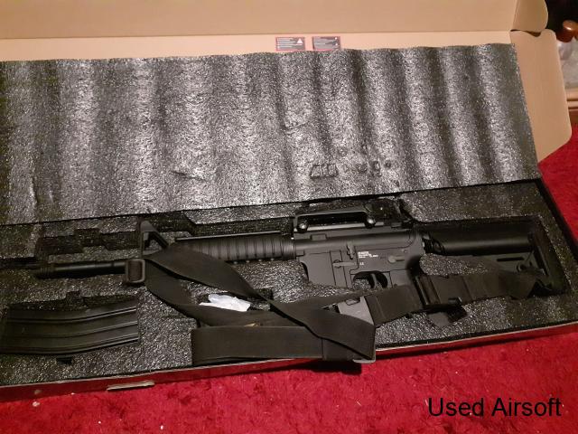 Full metal, used for two games before I bought my gas blow back. A very nice RIF in nearly new condition. Comes with two mid cap metal mags, hand guard covers and CAA sling.