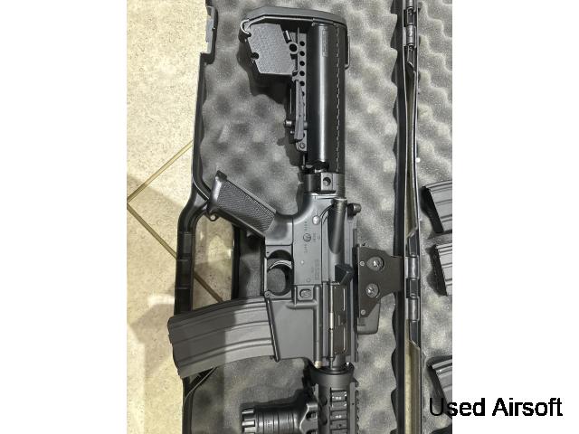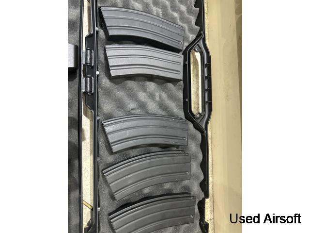 Original gun used for CQB sites, no modifications to the gun. Added laser, sights and grip but original iron sights and mag is included, have original box. Comes with 3 extra Mid Caps and 2 High Cap magazines.