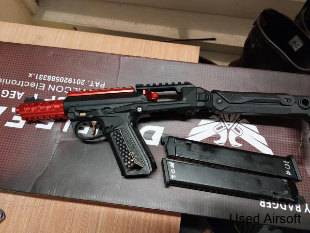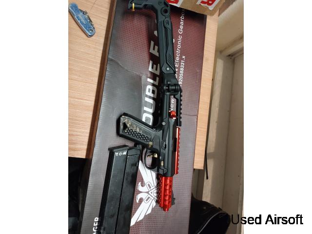 De Daniel defense pcc, fully working only used in a couple of games. Shoots great. Comes with 6 gas tight mags, all feed and lock back on empty. Changed the stock and grip, comes with foregrip, red dot and modlight clone torch and a mod button. £500, not looking for trades. Got a couple of bills to pay for, or you know...