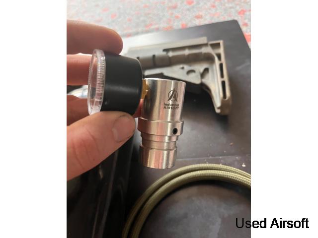 hop-up joint, M4 magazine adapter + 4 magazines (3-point and one Magpull type), original adapter and original magazine included . Sold with complete HPA preset except battery . I'm leaving the accessories on it as they are dummy parts.