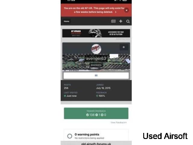 note: USED AIRSOFT "CONTACT SELLER IS DISABLED" YOU NEED TO EMAIL ME OR USE THE CONTACT NUMBER im not a retailer so no refunds, returns or warranties payment by bank transfer, paypal friends & family or cash on collection only However, for your peace of mind here is my airsoft forums uk site, 138 sales 100% feedback. Airsoft forum UK has just updated its system and wiped everyones feedback, so i have lost 10 years worth, their answer was take a picture before its wiped so thats in the advert pics below. I can do a test video once a deposit paid for your piece of mind
