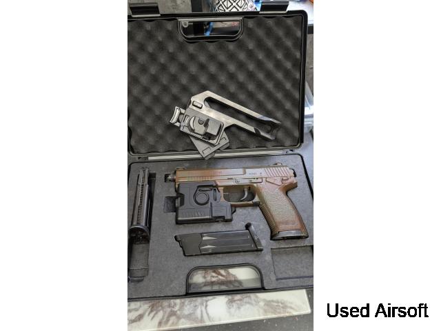 Ssx23, green gas non blowback pistol, comes with one leak free magazine, foam filled silencer, novritsch leg holster and x2 pouches for extra mags or mk5 grenades (fit perfectly) and pistol has been Ghillied by trigger_warning_airsoft, a snipers perfect side arm. Very gas efficient....