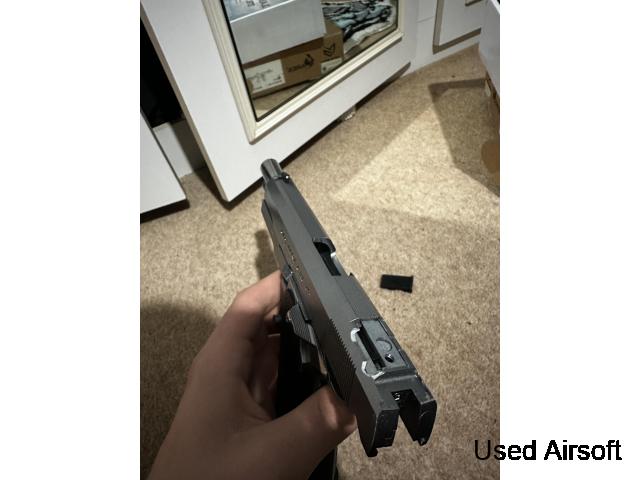 Slide is damaged. During an event, a small spring punctured through the slide. Sight was taken off to show the damage. Maybe with some new parts and some know how, can be made fully working again.