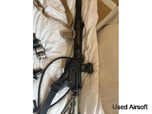 MK18 GBBR with two different HPA adaptors ones a duel mag conversion and the other is a standard HPA mag change. Both work perfectly. Has had a buffer tube change to make the recoil heavier